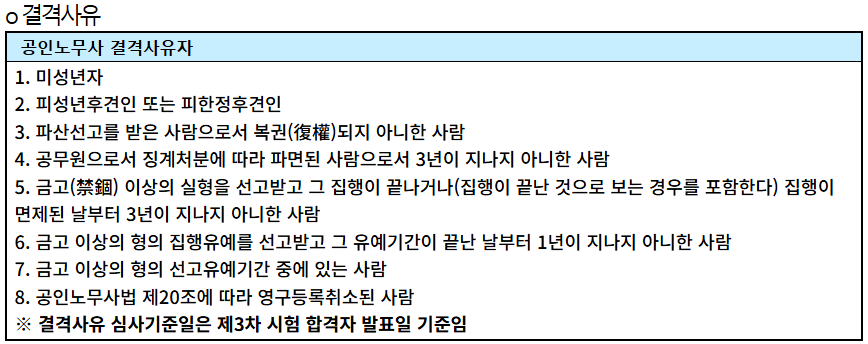 • 다만, 피성년후견인이나 금고 이상의 실형을 선고받은 사람은 일정 기간 응시가 제한됩니다.