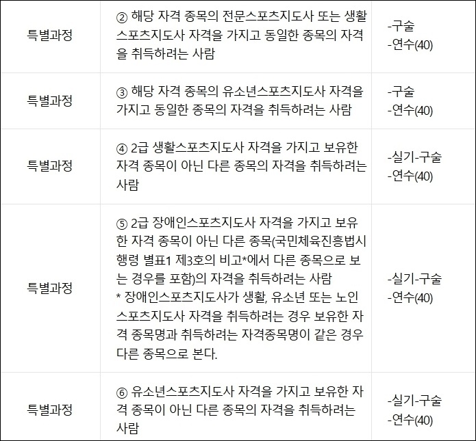 - 유소년 스포츠 지도사 자격 보유자 : 동일 종목 신청 시 실기 및 구술시험 면제
