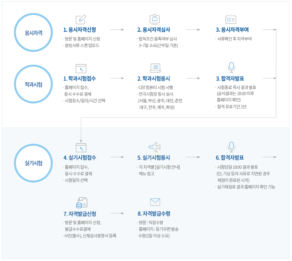 - 회원가입 → 시험 접수 → 시험장 및 시간 선택 → 결제