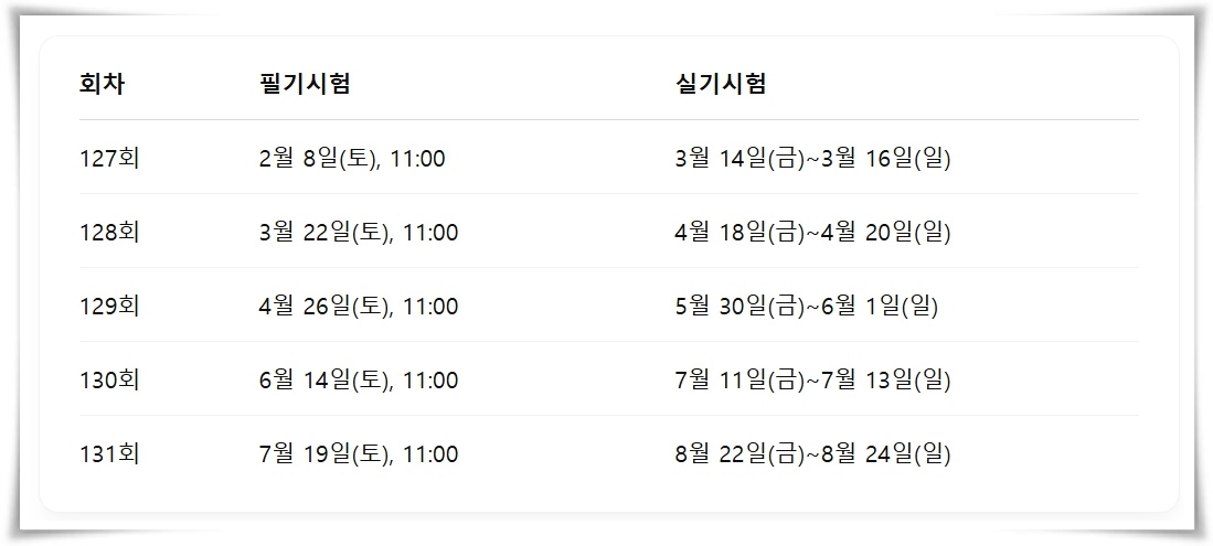 • 유효기간: 필기 합격 후 2년 이내 실기 응시 필요